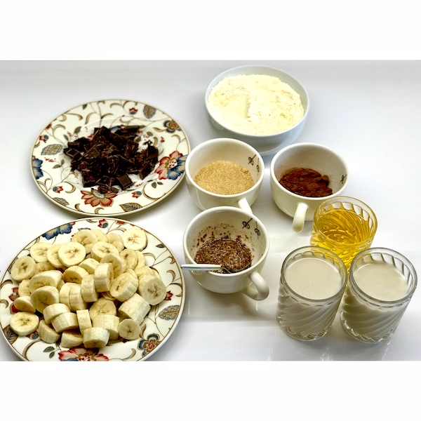 Usando il Bimby o una semplice terrina, schiacciare bene le banane, poi aggiungere nell’ordine le farine (già mischiate con sale, lievito e fecola di patate), il latte, l’olio (ed eventualmente lo yogurt di soia) e il flax-egg.